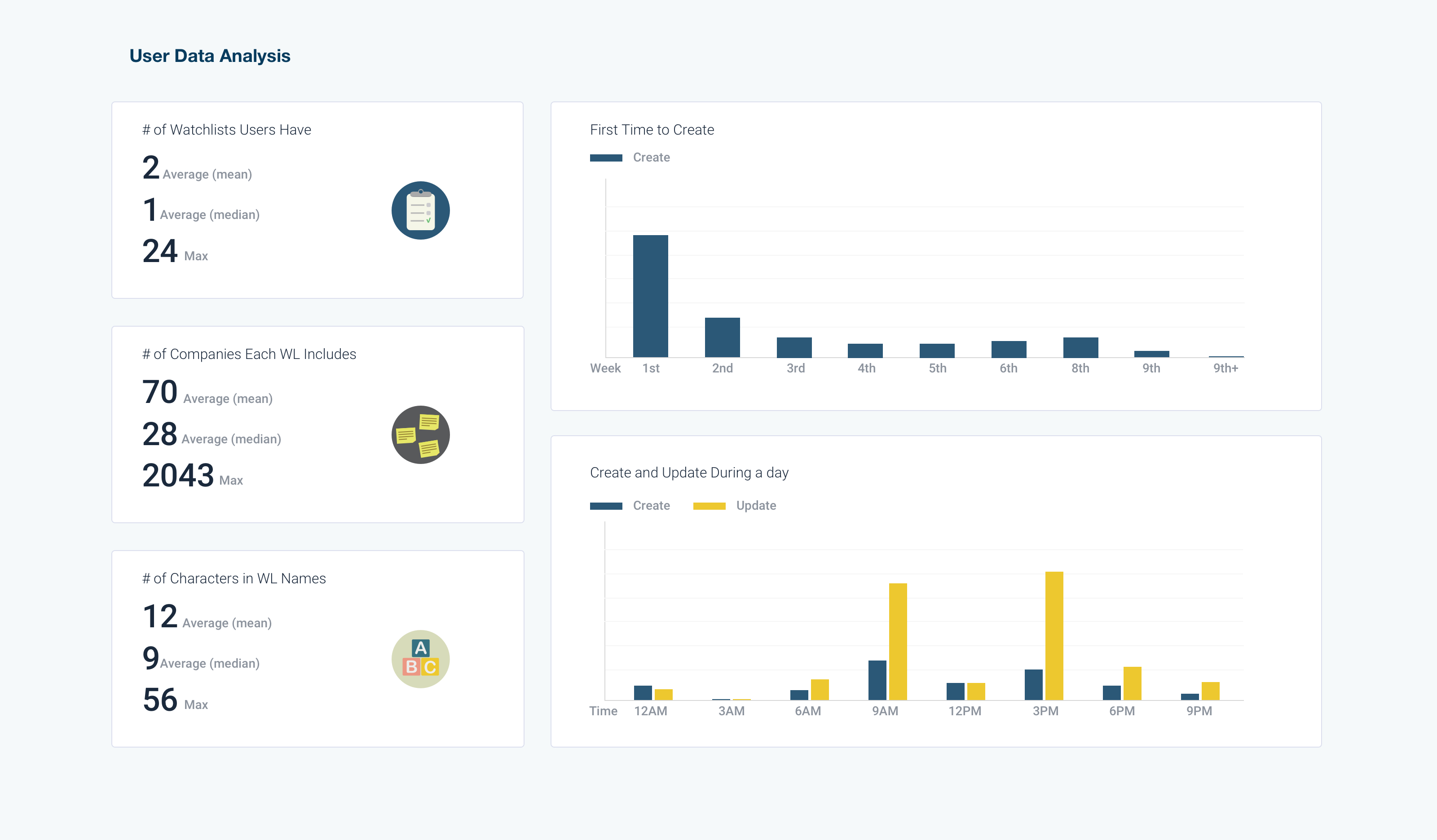 I thought it was important to understand behavior patterns of the end-users from three perspectives. First, how many watchlists did active users maintain at any given time? When did they create them? Second, how many companies did they include in one watchlist? What attributes did these companies share? Third, how did our clients name their watchlist(s)? Did the names indicate any information about how they use their watchlists?
