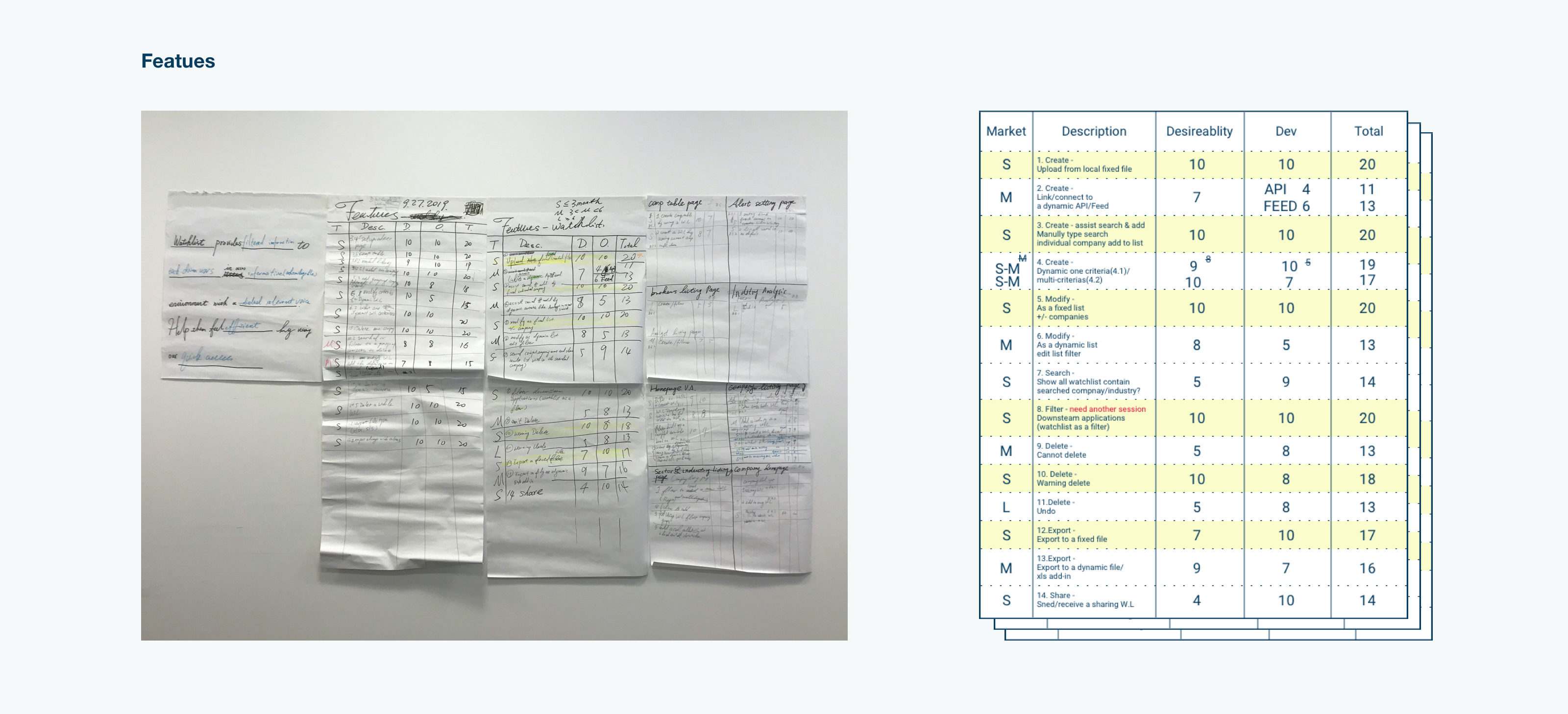 During this step, we needed to separate vaguely described features into specific sub-features. As an example, ‘create a watchlist on the homepage’ is a vague feature. We need to clarify where and how.In this version, Watchlist had companies grouped into one watchlist, which was identified as a basic feature in the short-term.