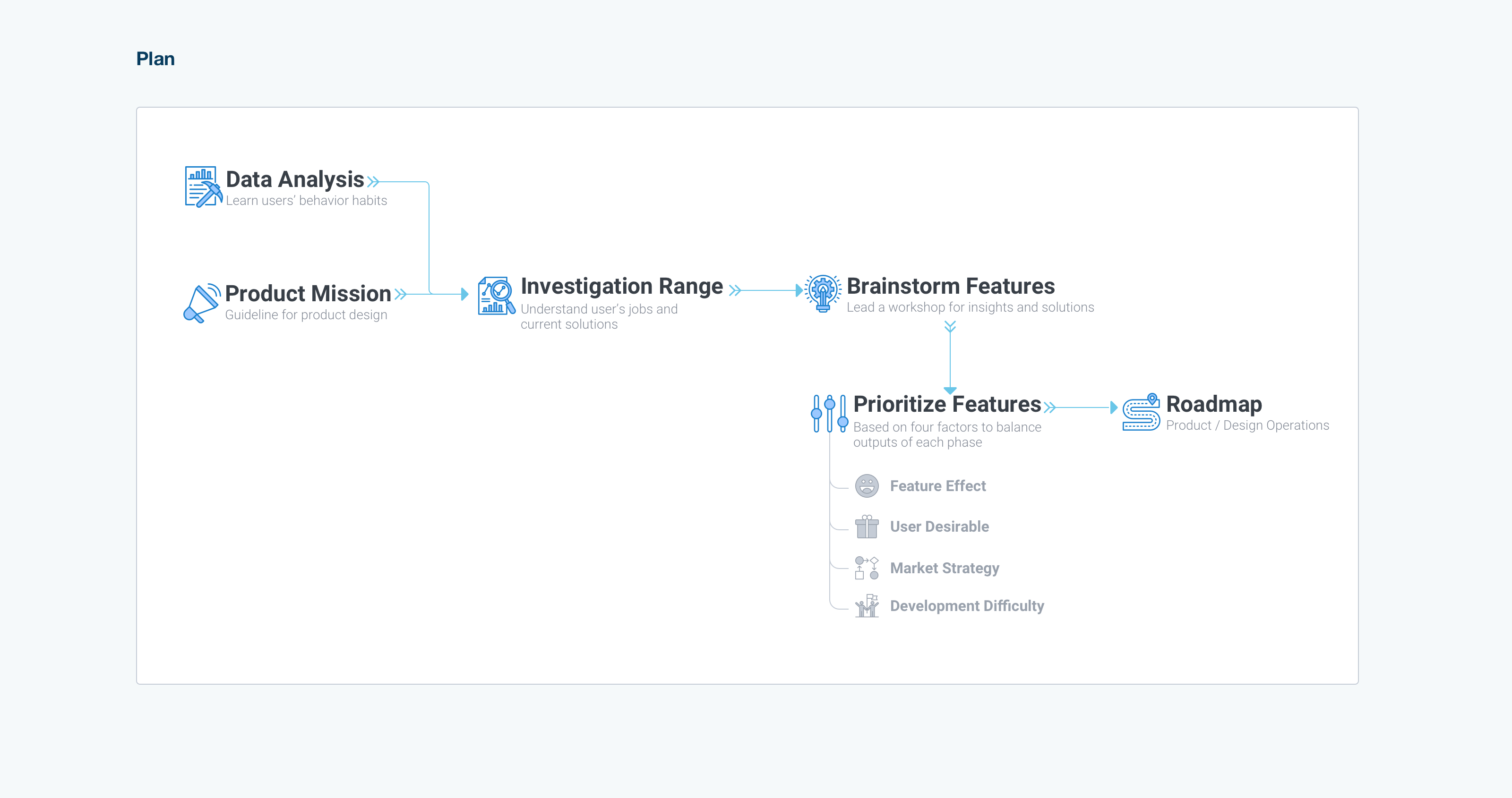 Based on the answers provided in the previous step, we brainstormed both solutions and features. After listing all of them, we measured them against four factors, marketing term, users' desirable, effect of features, and development difficulty. We divided the marketing term into short, middle, and long-term. Feature effect was divided into basic effects, performance improvement, and delighted effect. Users' desirable and development difficulty were each rated from 1 to 10.