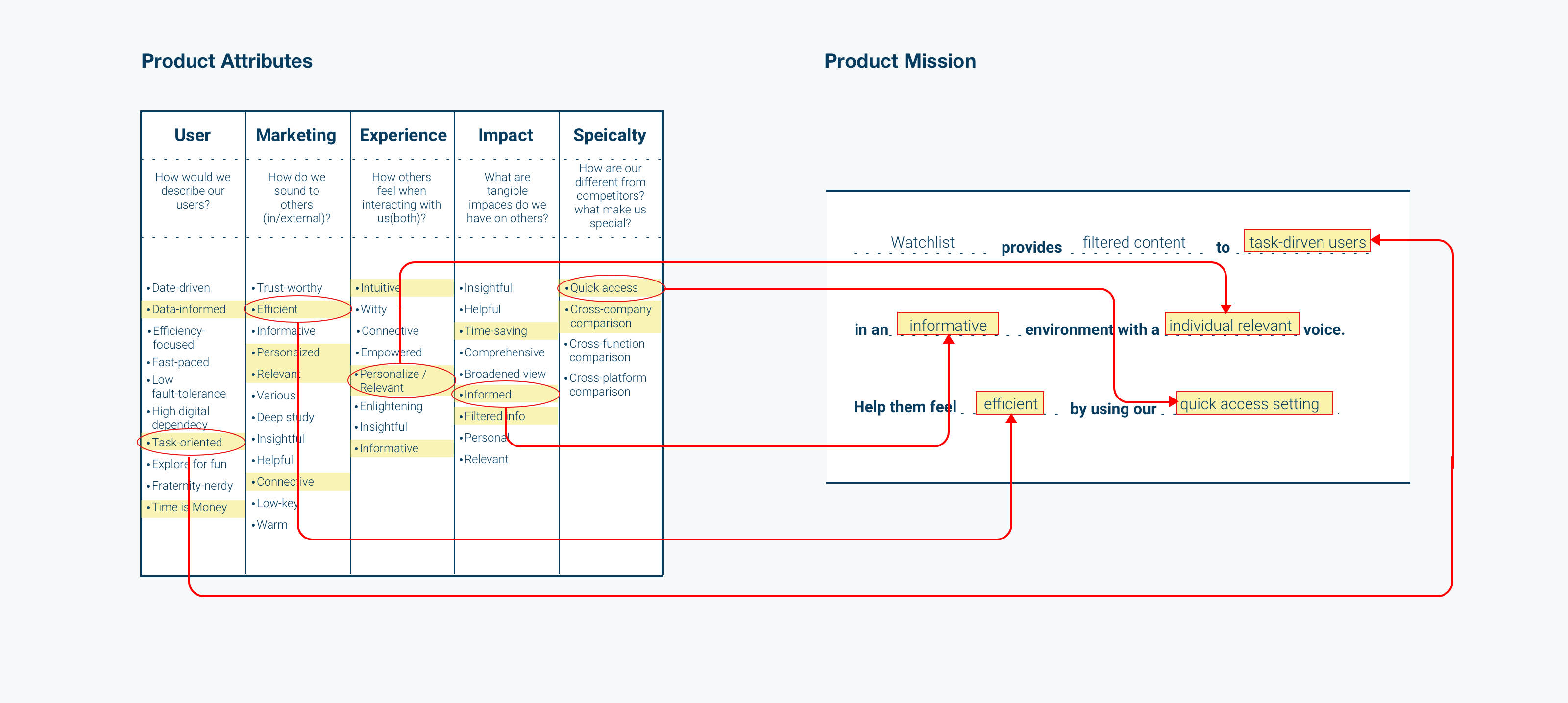 Due to the hectic and complicated work schedules of our primary end-users (financial professionals), there was no opportunity to speak directly with clients for their direct feedback on needs and issues related to Watchlist. Thus, as the first step, I studied the database to learn user behavior. Next, I facilitated a workshop with the established team for the product redevelopment. This group included the PM, Marketing Specialists, members of the Development Team, members of the Client Support Team and me. The workshop focused on defining the product mission, followed by developing users' portraits and prioritizing the features related to Watchlist. The last step was for me to create a product plan that included short-term, mid-term ,and long-term goals to capture the prioritized features.
