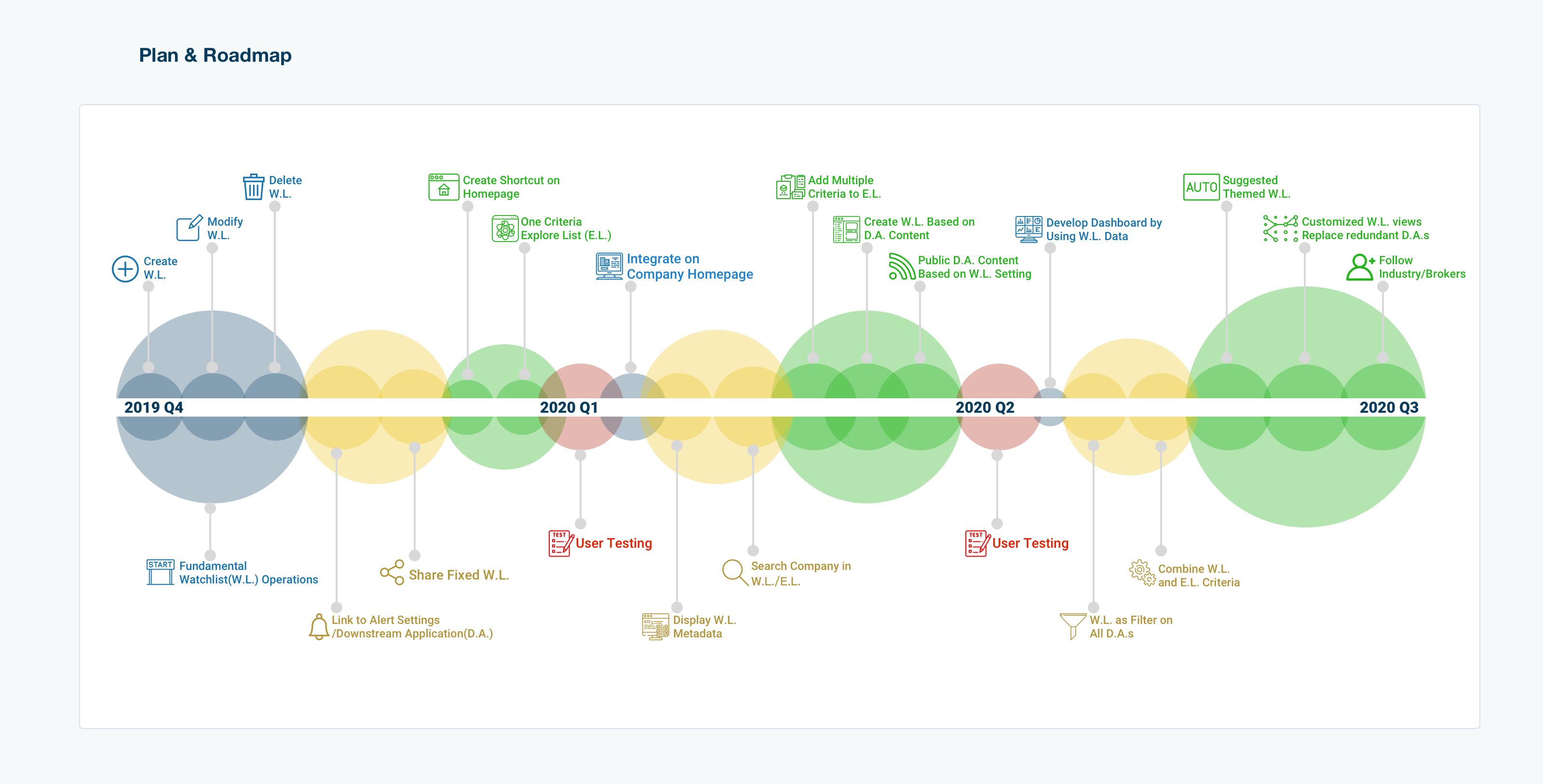 As an enhancement, we proposed a watchlist based on filters, such as hotel industry companies. We called it an ‘explore list’. To create one filter for the explore list is a basic feature in the mid-term. Further, to create filter combinations was a delighted feature in the long-term, such as the top 20 hotel companies plus Airbnb. To ensure the benefits of these innovation features, we needed to conduct testing after the first term.