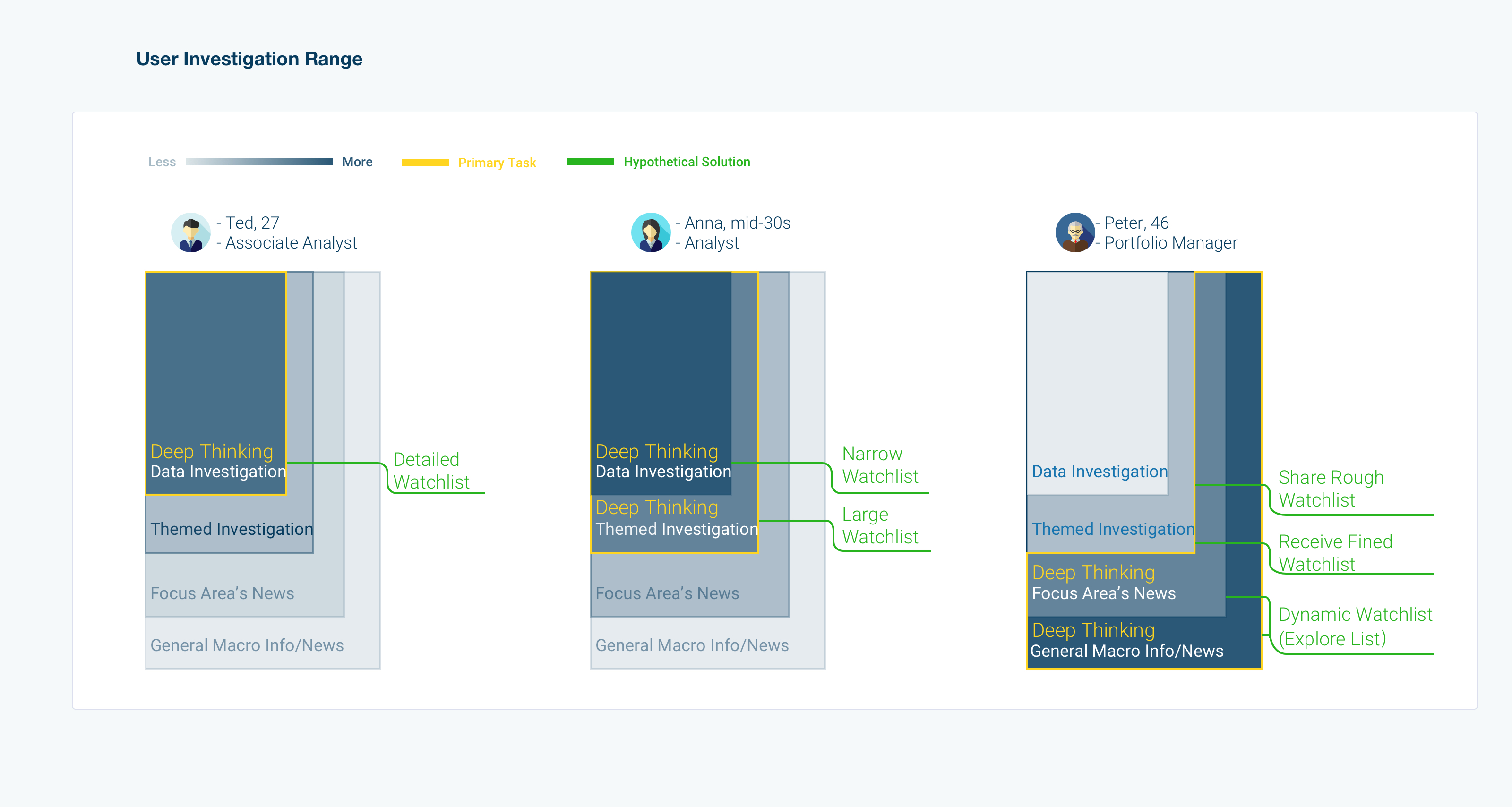 We conducted an analysis of our users' archetypes and roles within financial firms. Based on these roles, we listed how they process industry data and content every day. How did Watchlist help or benefit them? Moreover, which tasks did our product leave unsupported for them?